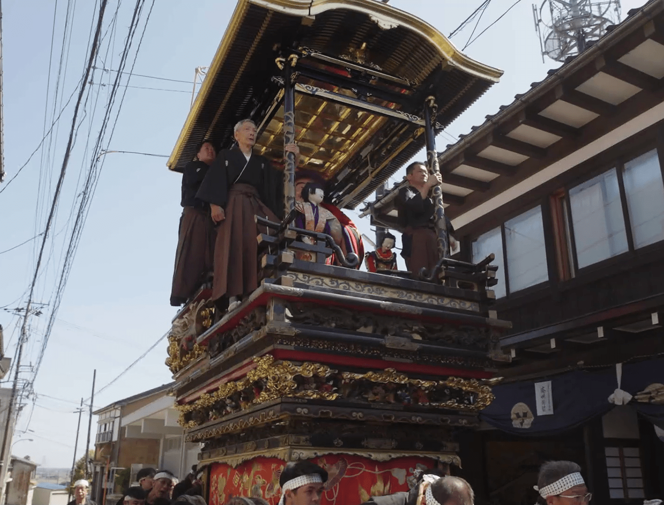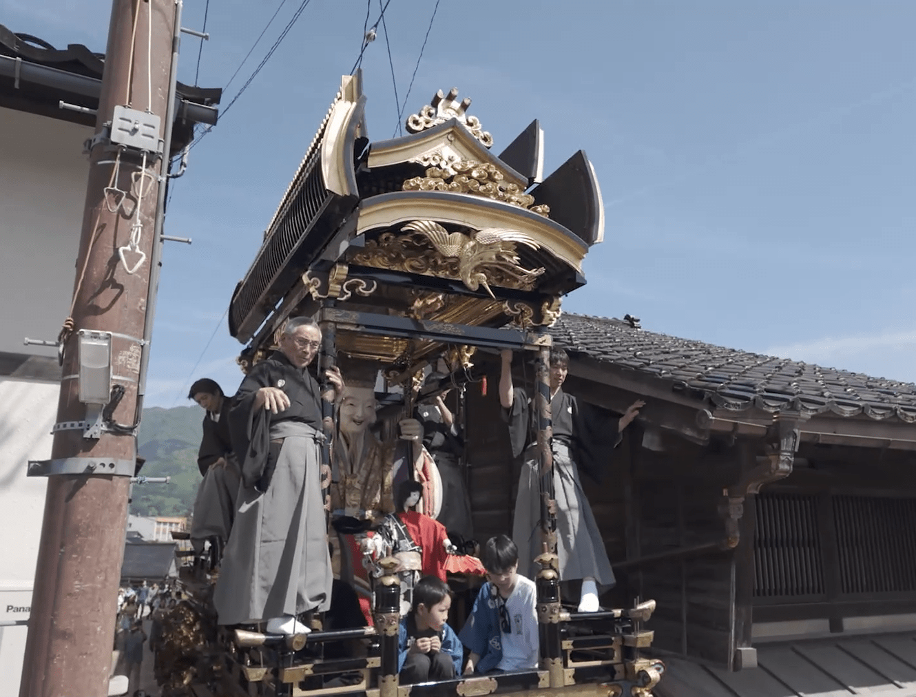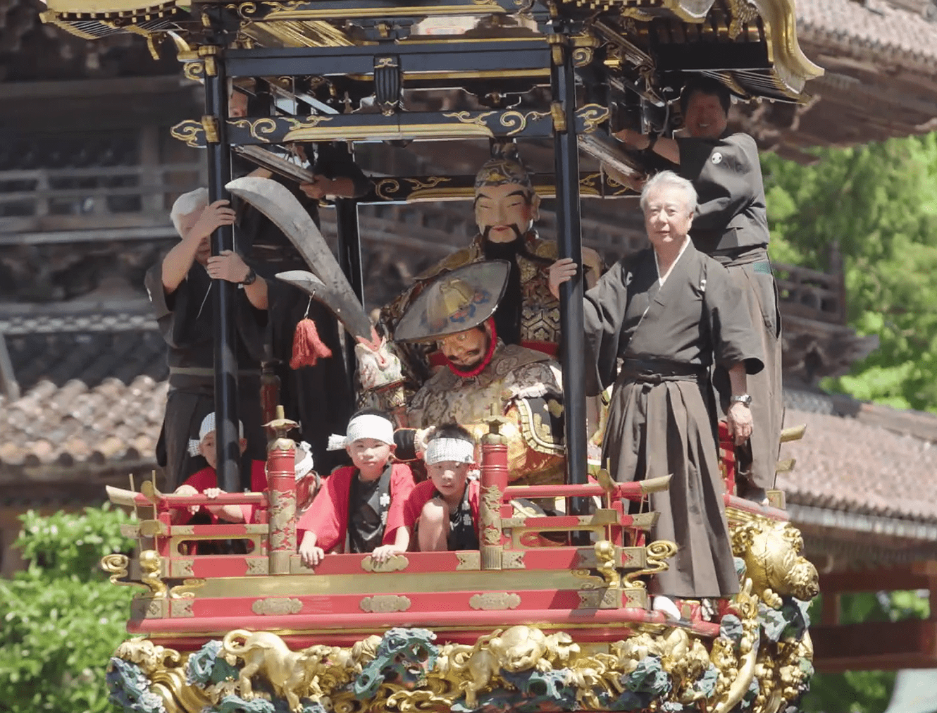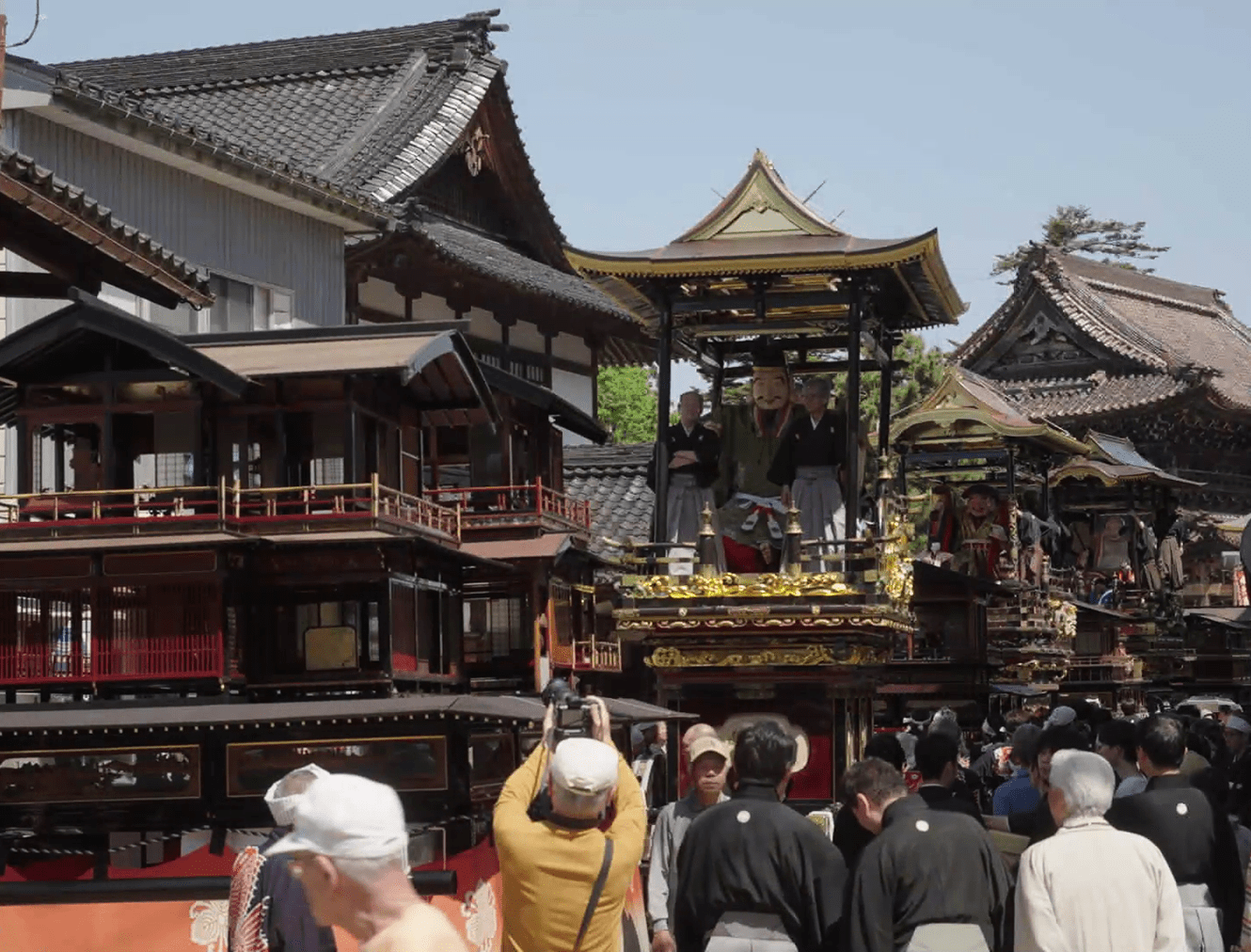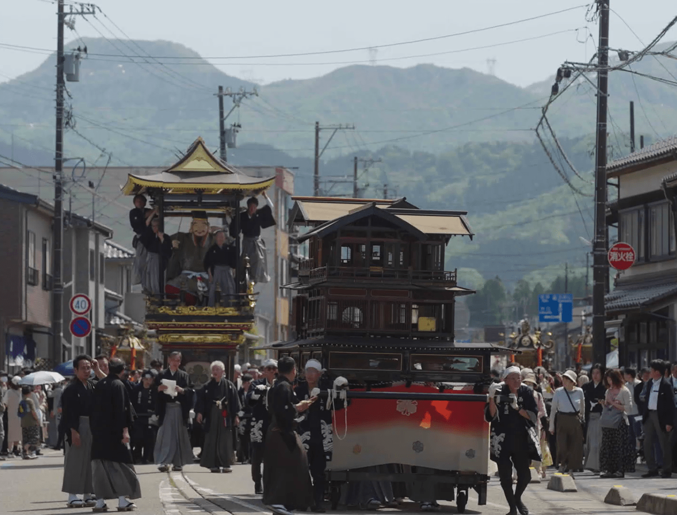 In the spring festival of ‘Little Kyoto of Etchū,’ ornately carved floats and small portable stages, accompanied by lion dances, parade through the town to the sounds of traditional io-uta songs, shamisen, and taiko drums.