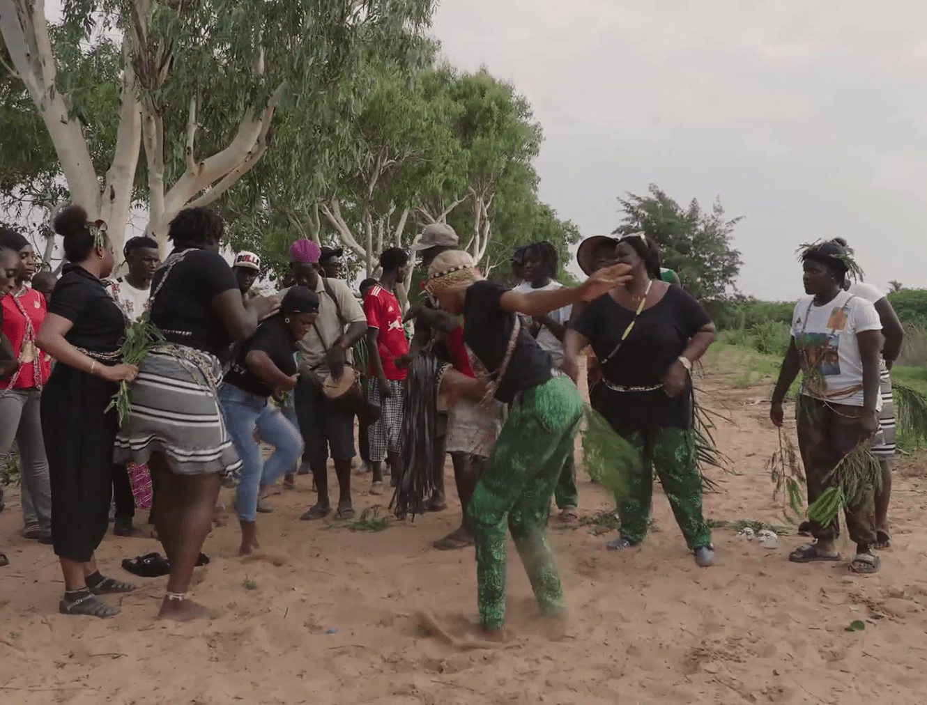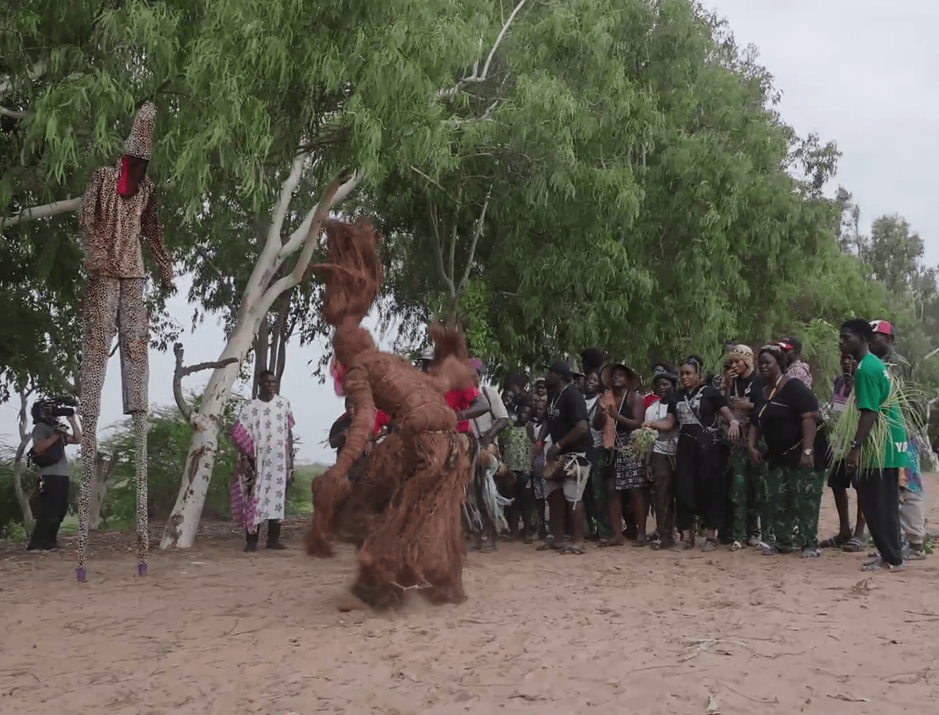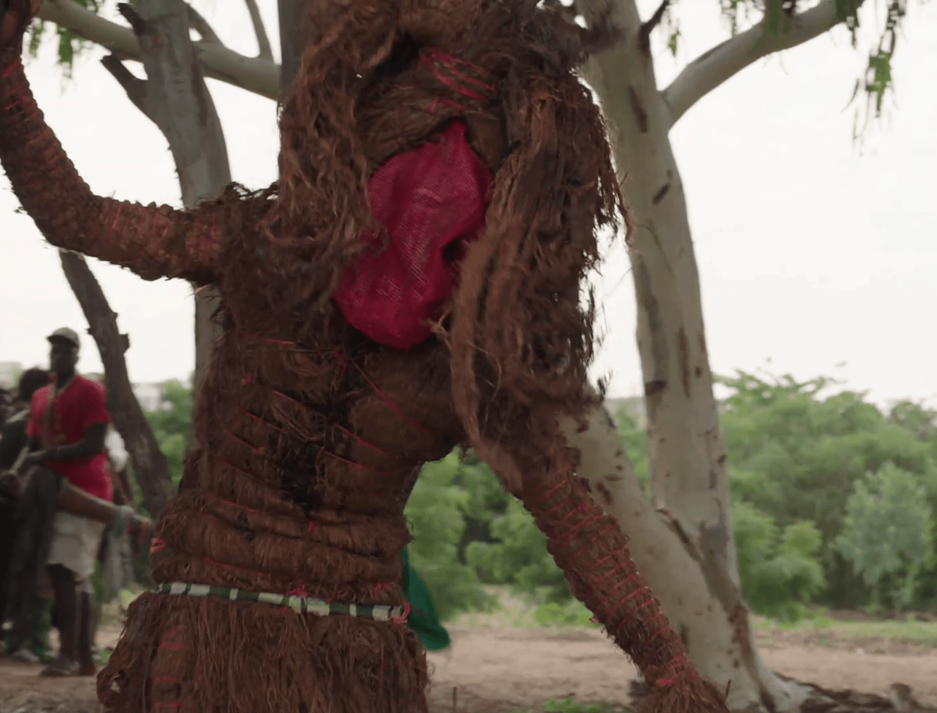 The Kankurang is a circumcision ritual still practiced in parts of Senegal, featuring a figure that resembles a walking tree parading through the streets. The performance by the Doudou family was filmed on Gorée Island.