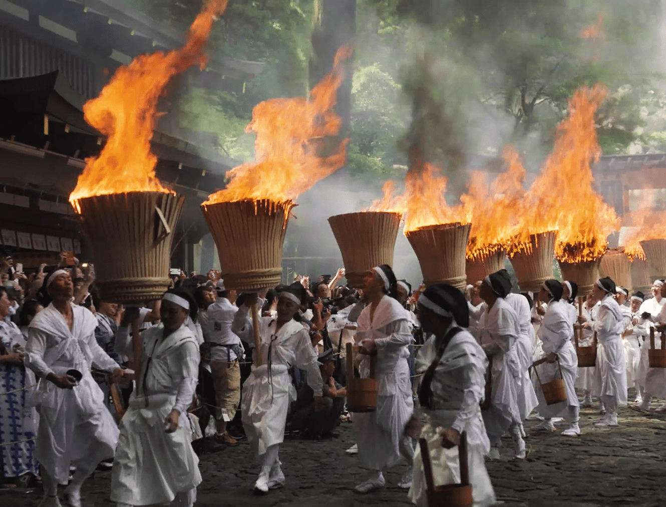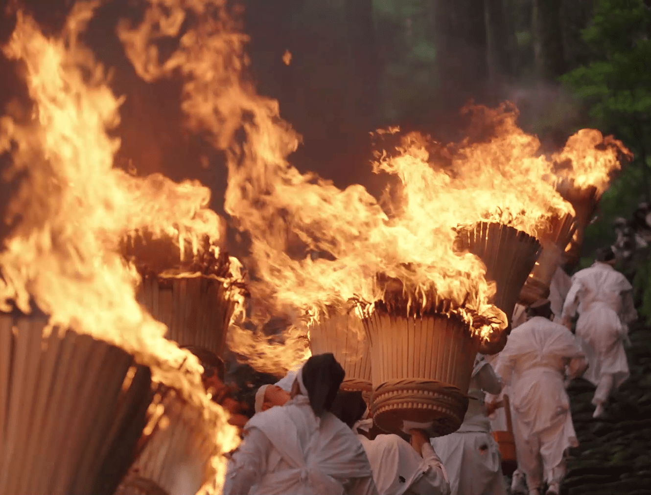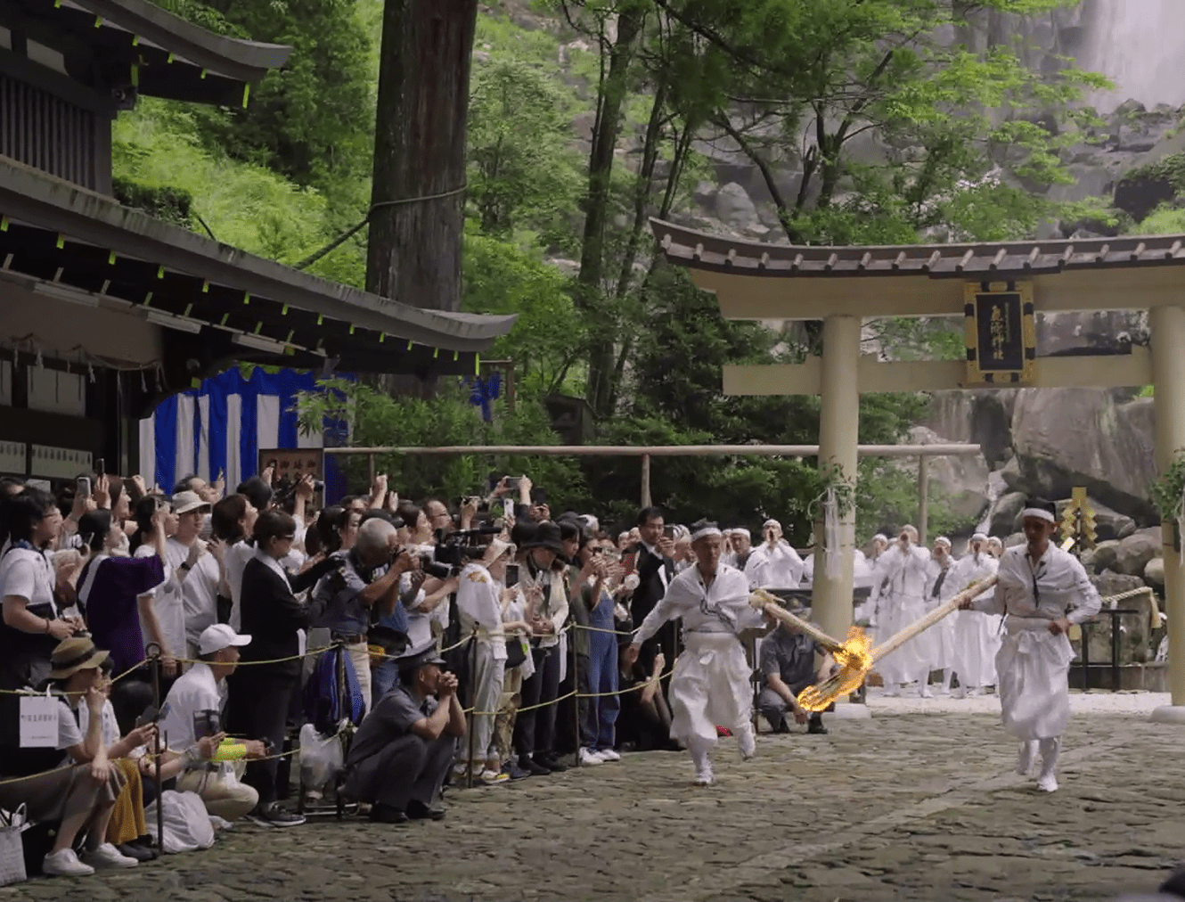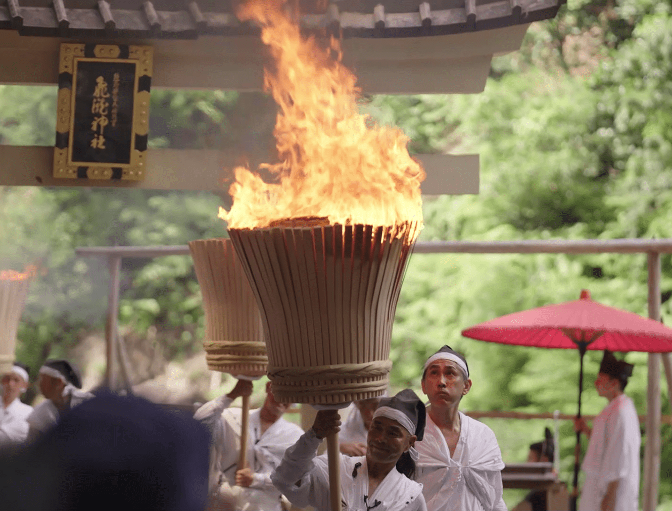 The spirits of the deities are transferred to twelve portable shrines called ogi mikoshi, each about six meters tall and shaped like a fan to represent the sun. These mikoshi are then carried in a procession from the main shrine to Nachi Falls. Along the approach to the falls, men dressed in white robes carry twelve massive torches, each weighing around 50 kilograms, purifying the path with fire as they welcome the mikoshi. This dramatic spectacle gives the festival its popular name, the "Nachi Fire Festival.”