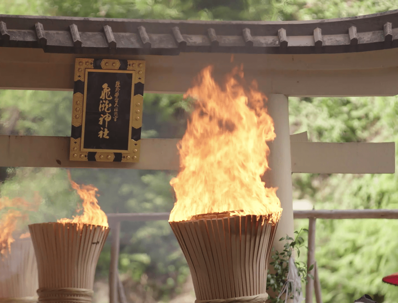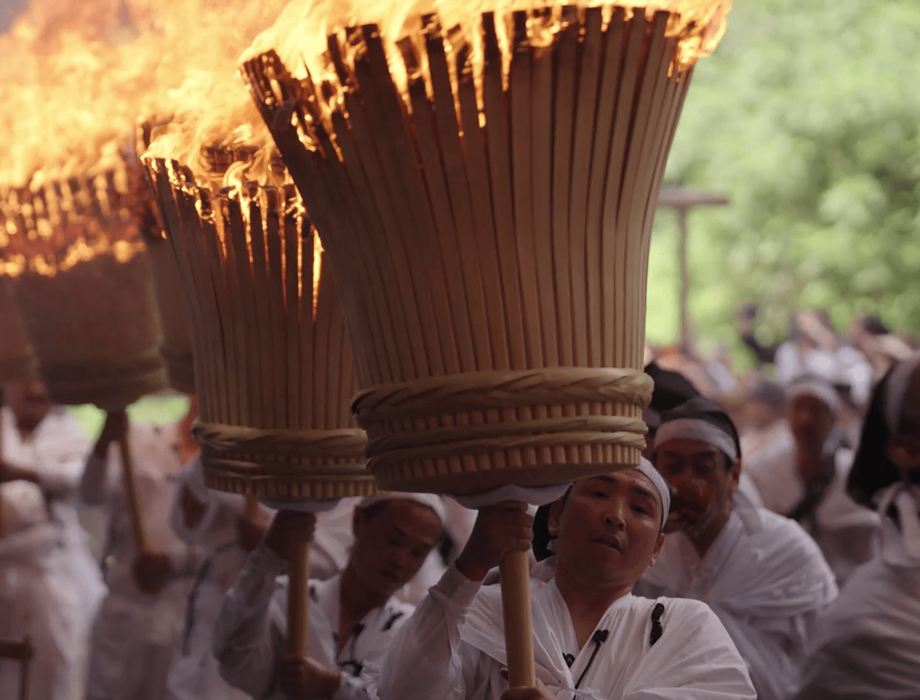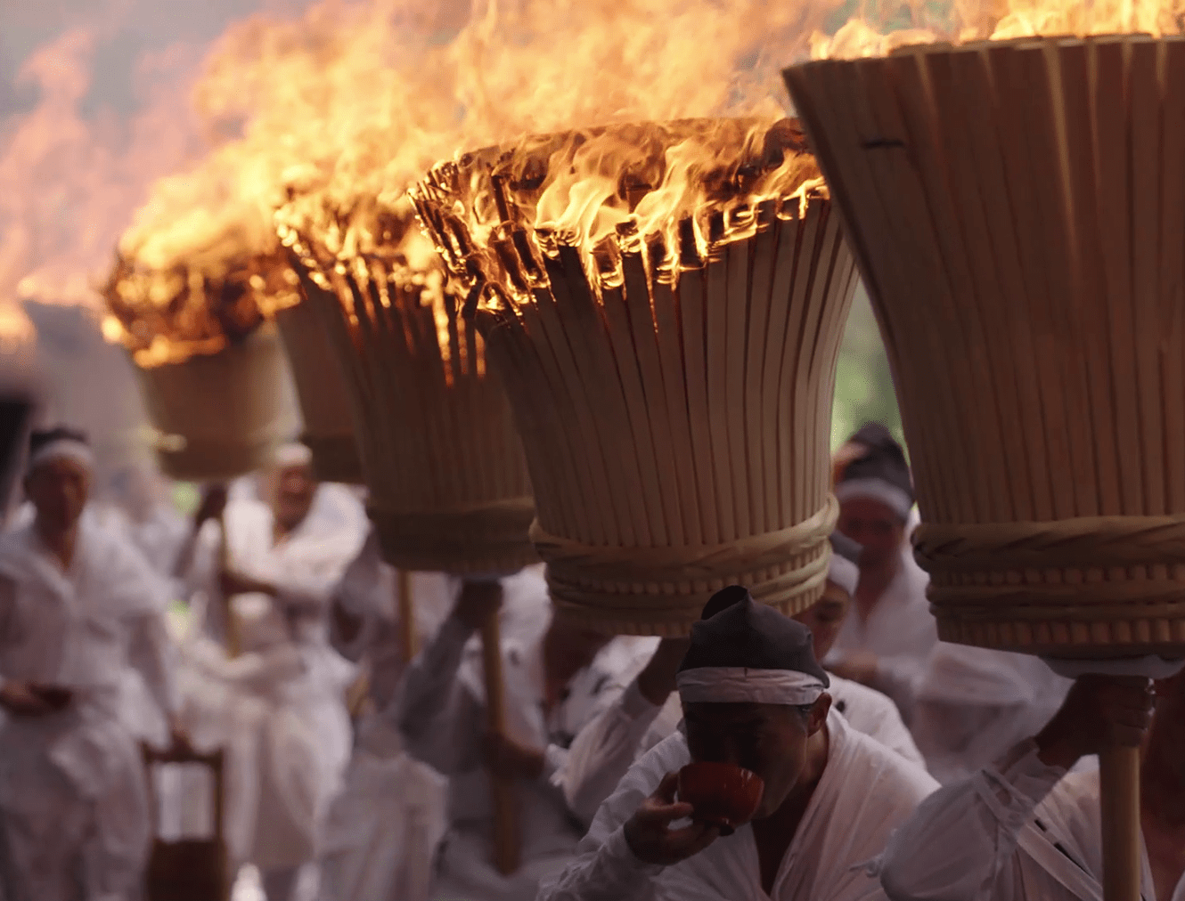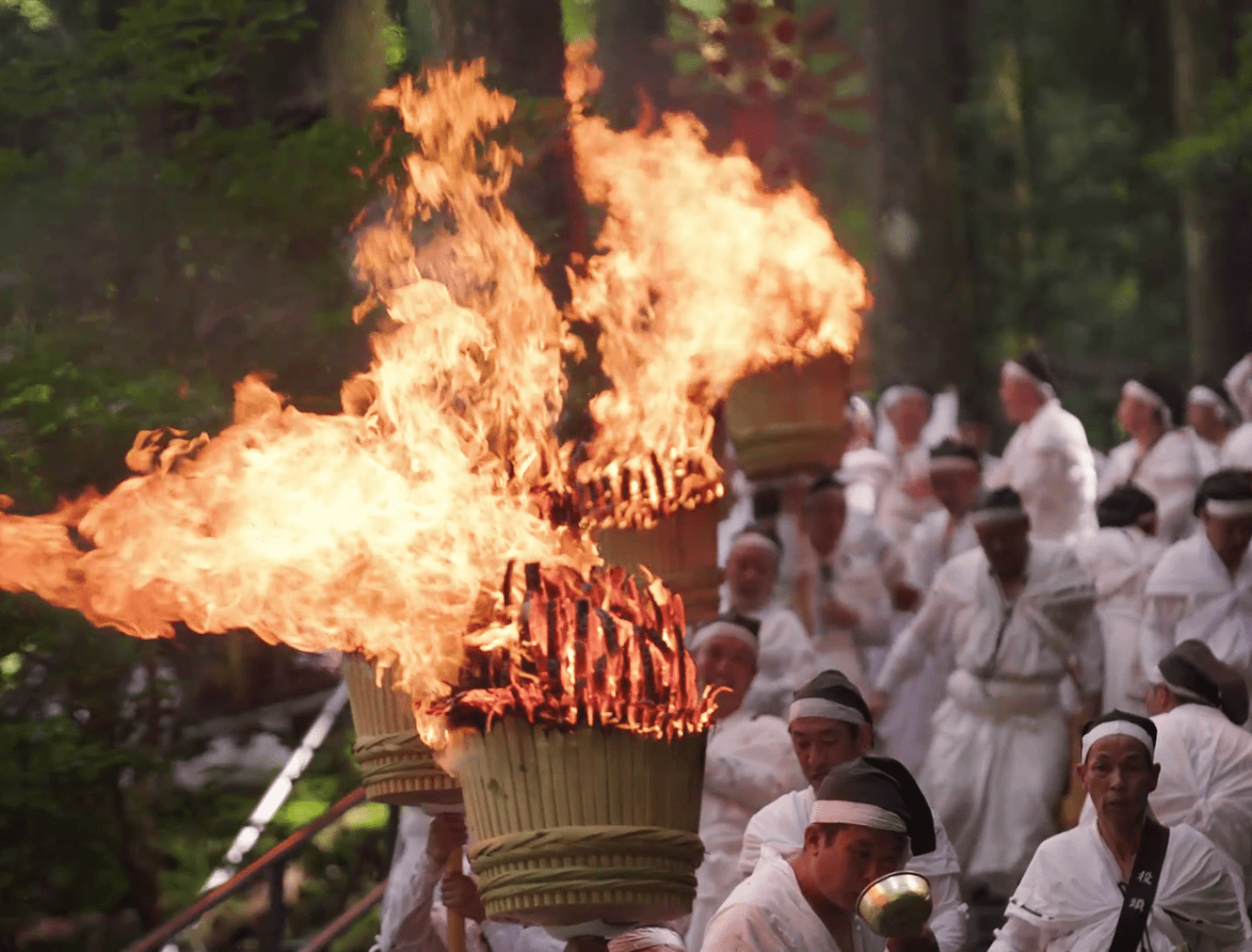 The spirits of the deities are transferred to twelve portable shrines called ogi mikoshi, each about six meters tall and shaped like a fan to represent the sun. These mikoshi are then carried in a procession from the main shrine to Nachi Falls. Along the approach to the falls, men dressed in white robes carry twelve massive torches, each weighing around 50 kilograms, purifying the path with fire as they welcome the mikoshi. This dramatic spectacle gives the festival its popular name, the "Nachi Fire Festival.”