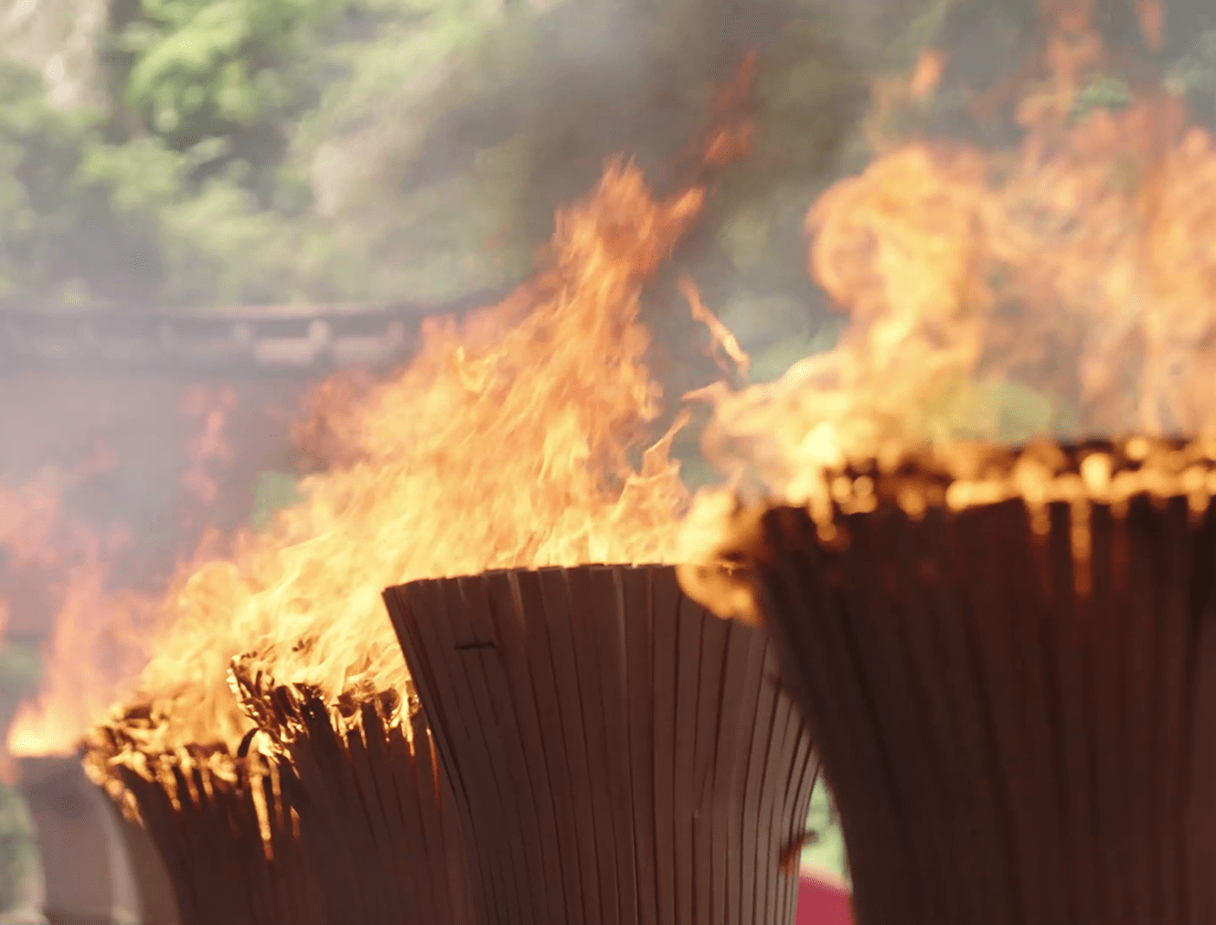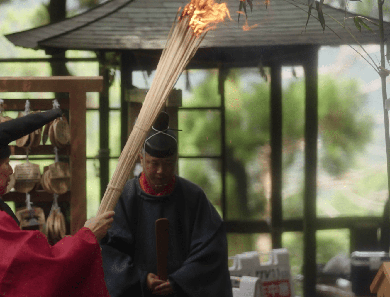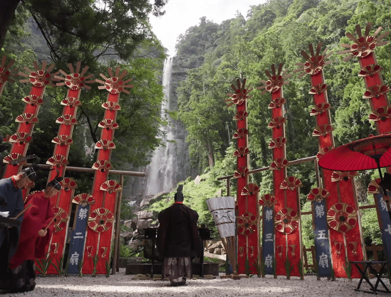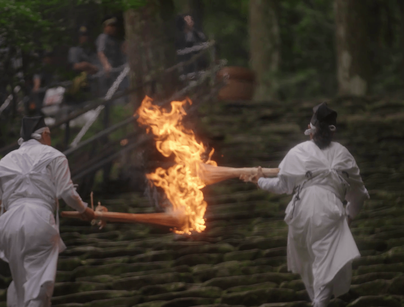 The spirits of the deities are transferred to twelve portable shrines called ogi mikoshi, each about six meters tall and shaped like a fan to represent the sun. These mikoshi are then carried in a procession from the main shrine to Nachi Falls. Along the approach to the falls, men dressed in white robes carry twelve massive torches, each weighing around 50 kilograms, purifying the path with fire as they welcome the mikoshi. This dramatic spectacle gives the festival its popular name, the "Nachi Fire Festival.”